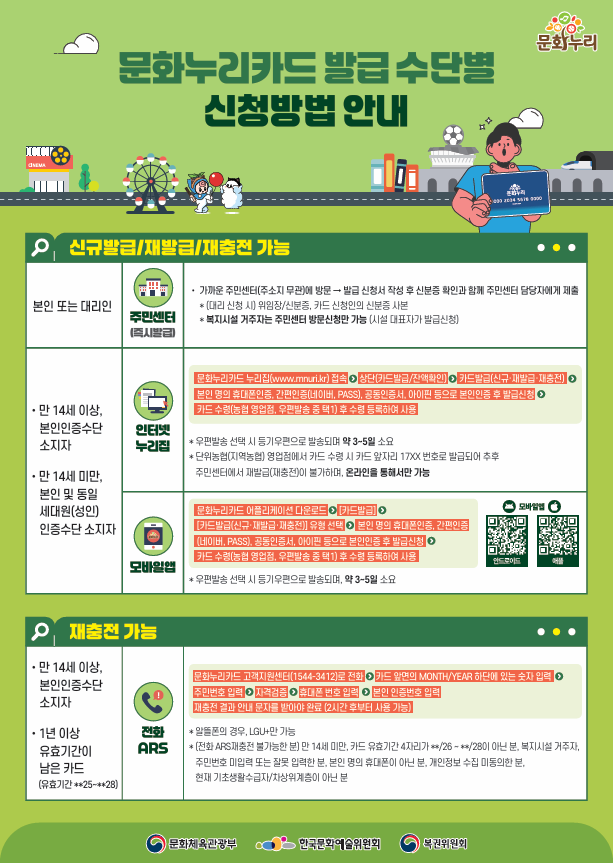 문화누리카드는 신청자격이 있는 대상자가 직접 신청해야 하며, 발급 방식은 온라인과 오프라인 두 가지 방법으로 제공됩니다.