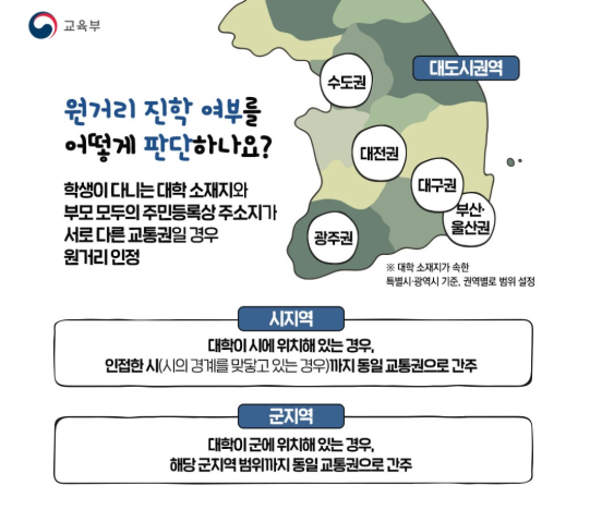 대학이 시에 위치한 경우, 인접한 시(시의 경계를 맞닿고 있는 경우)까지 동일 교통권으로 간주되며, 대학이 군에 위치해 있는 경우는 해당 군지역 범위까지 동일 교통권으로 간주된다고 합니다.